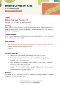The Raising Confident Kids Parenting Resource is a three-part video series designed to help Christian parents grow in confidence as they raise children to know and follow Jesus in a confused world.